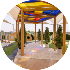 A children's play area with a colorful canopy.
